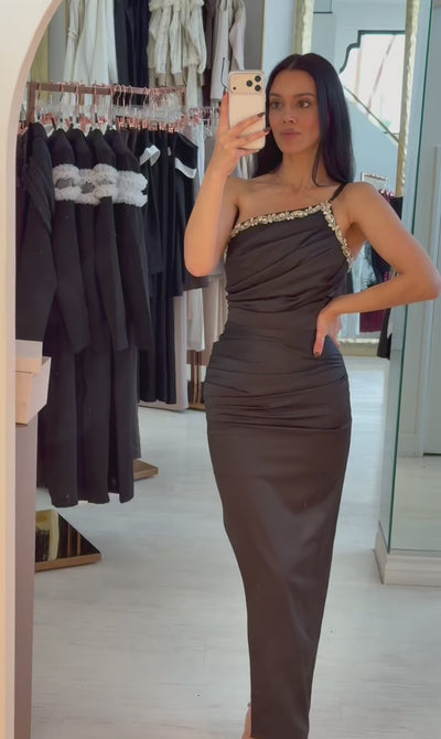 “Wels" satin asymmetrical dress with crystal details